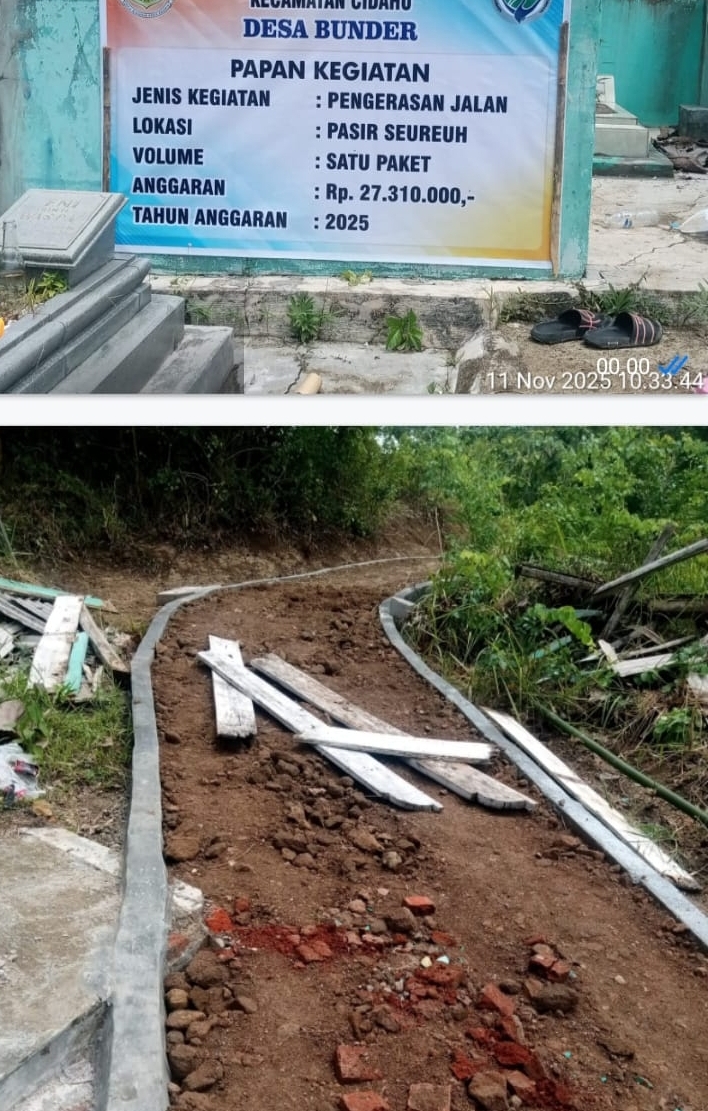 Terpantau dilokasi kegiatan pekerjaan pengerasan jalan Pasir Seureuh pada papan informasi kegiatan hanya tercantum keterangan tentang volume satu paket bukan keterangan panjang serta lebar jalan pada umumnya pekerjaan jalan, Namun tercatat pada papan informasi nilai anggaran sebesar Rp.27.310.000.00. Ironisnya tidak disertakan keterangan asal sumber anggaran pada kegiatan pekerjaan tersebut oleh pihak pemerintah desa Bunder selaku pelaksana dan penanggung jawab kegiatan pekerjaan.