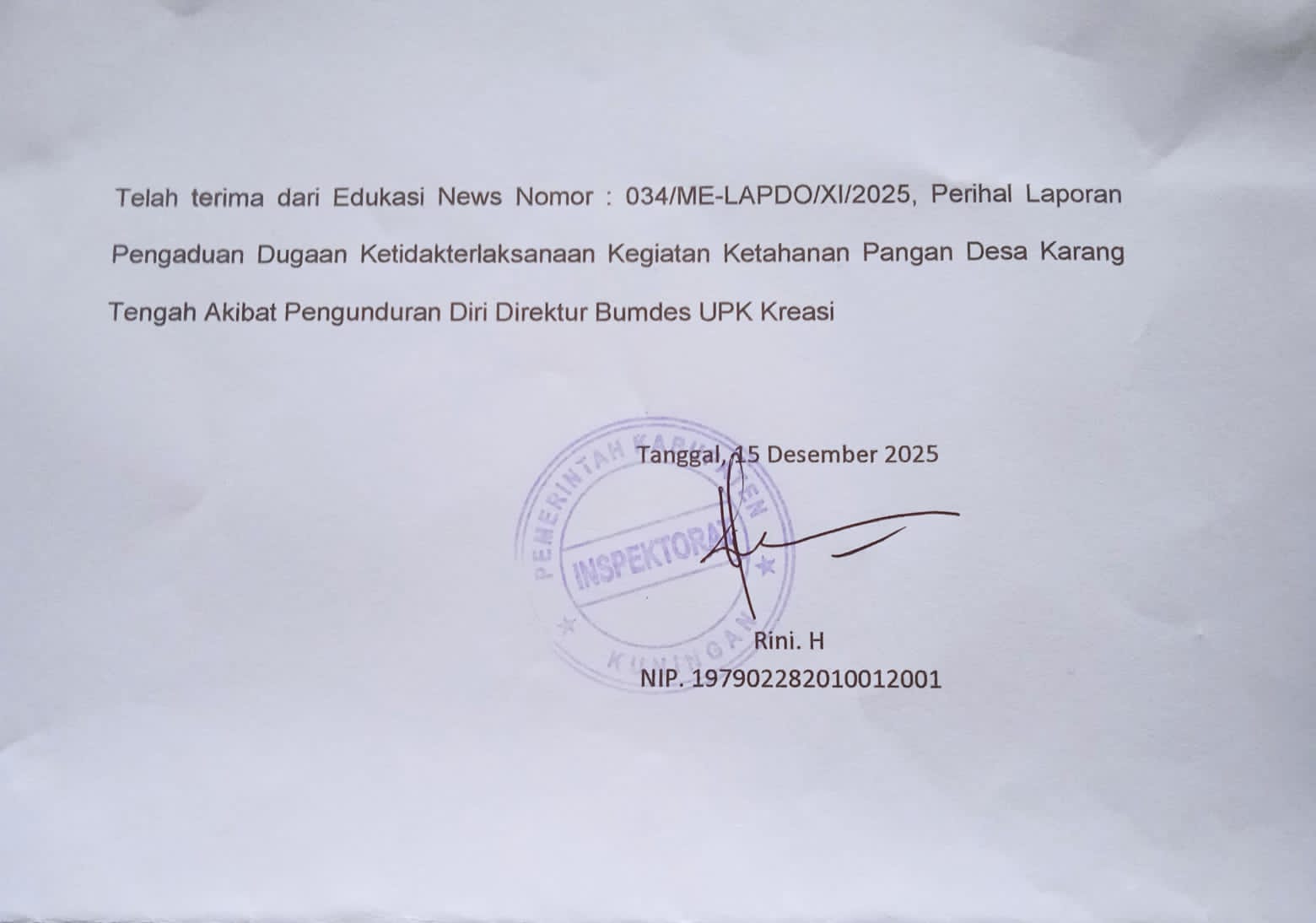 Guna memastikan keseriusan pemerintah daerah dalam menangani dugaan keterlambatan realisasi program ketahanan pangan (Ketapang), Tim Media EDUKADINEWS secara resmi melayangkan surat aduan masyarakat ke Inspektorat Kabupaten Kuningan, Jawa Barat.
