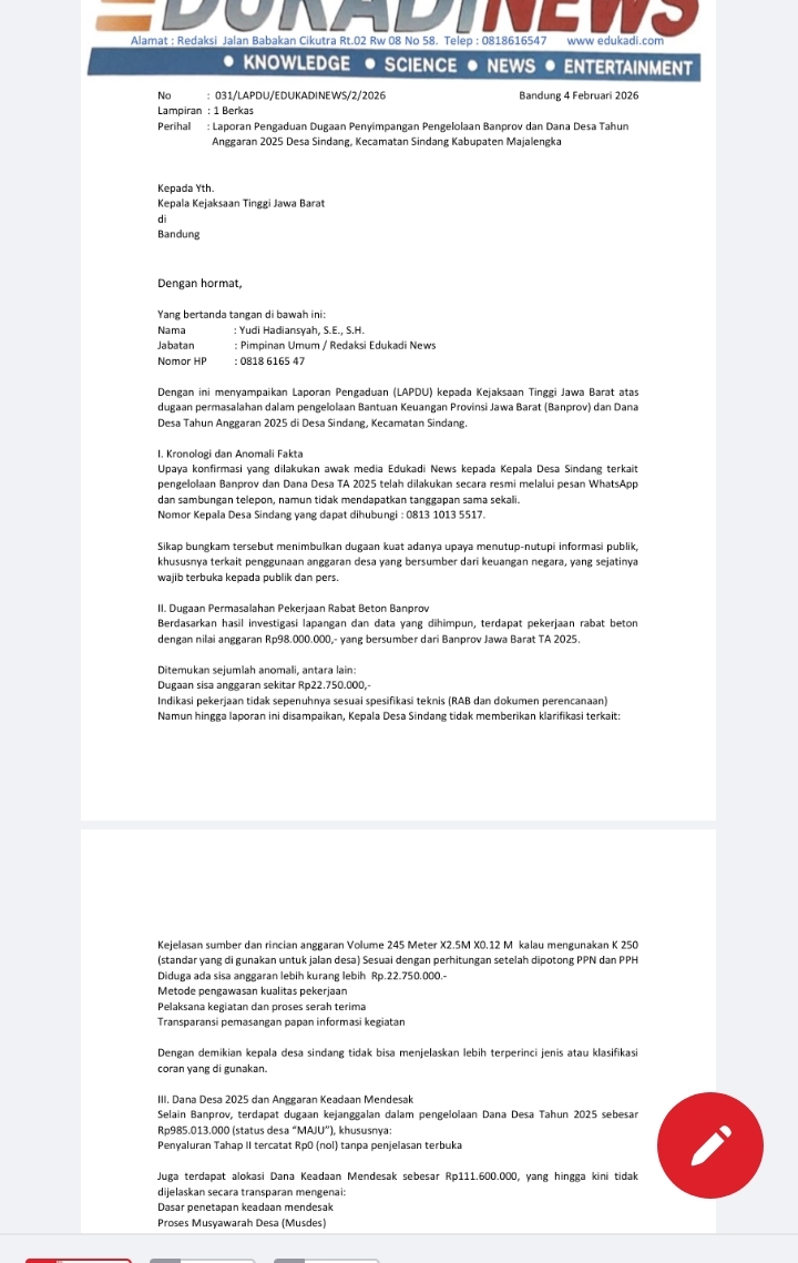 Media Edukadi News menyatakan siap melaporkan Pemerintah Desa Sindang, Kecamatan Sindang, Kabupaten Majalengka, ke Kejaksaan Tinggi Jawa Barat (Kejati Jabar) atas dugaan penyimpangan pengelolaan Bantuan Keuangan Provinsi (Banprov) Jawa Barat dan Dana Desa Tahun Anggaran 2025.