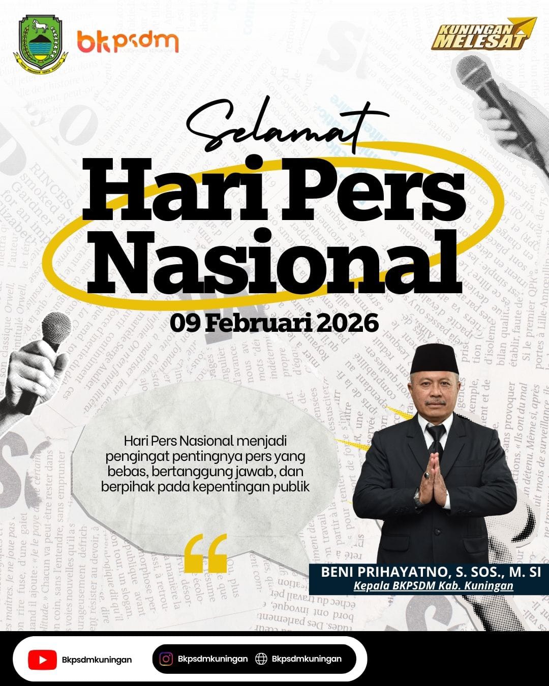 Beni Prihayatno. S. SOS.M.,SI. Kepala BPSDM ( Badan Pengembangan Sumber Daya Manusia) kabupaten Kuningan Jawabarat mengucapkan selamat Hari Pers Nasional (HPN) 9 Februari 2026.